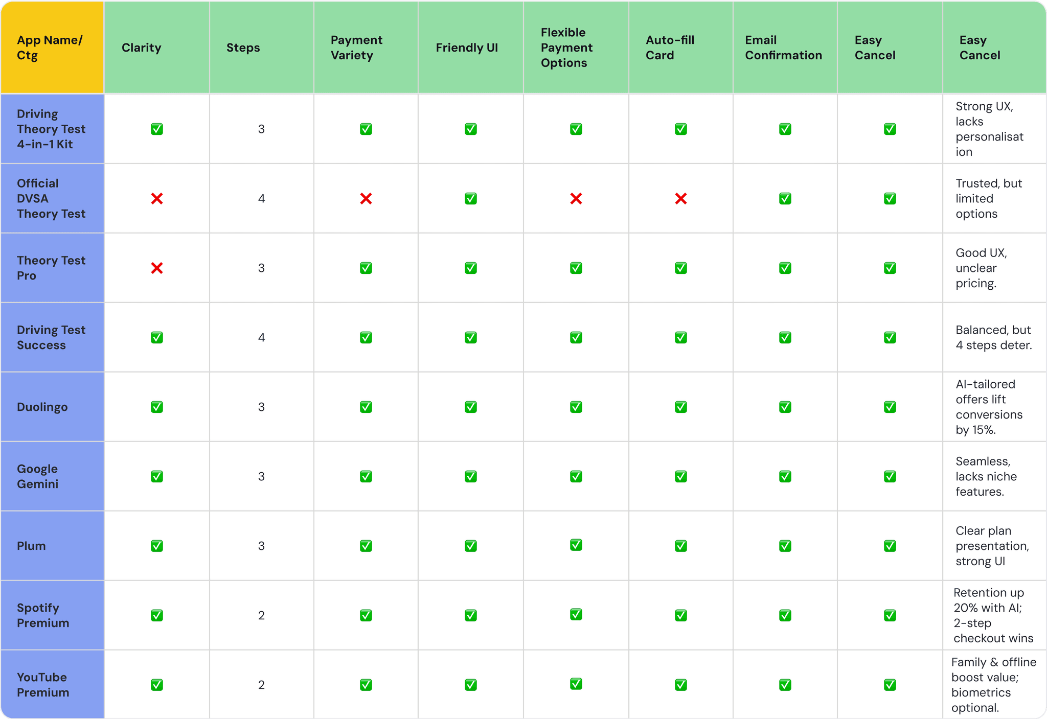 Competitor analysis showed that apps like Duolingo, Spotify, and YouTube perform well by using 2–3 step checkouts, clear pricing, visible trial terms, and integrated payment options like Apple Pay. In contrast, apps like Driving Theory Test 4-in-1 Kit and DVSA Kit lack clear “Manage Subscription” pages, hide the “Cancel” button, and don’t send email confirmations, leading to user confusion and complaints. These insights point to key opportunities for improvement in clarity, user control, and post-payment communication.
