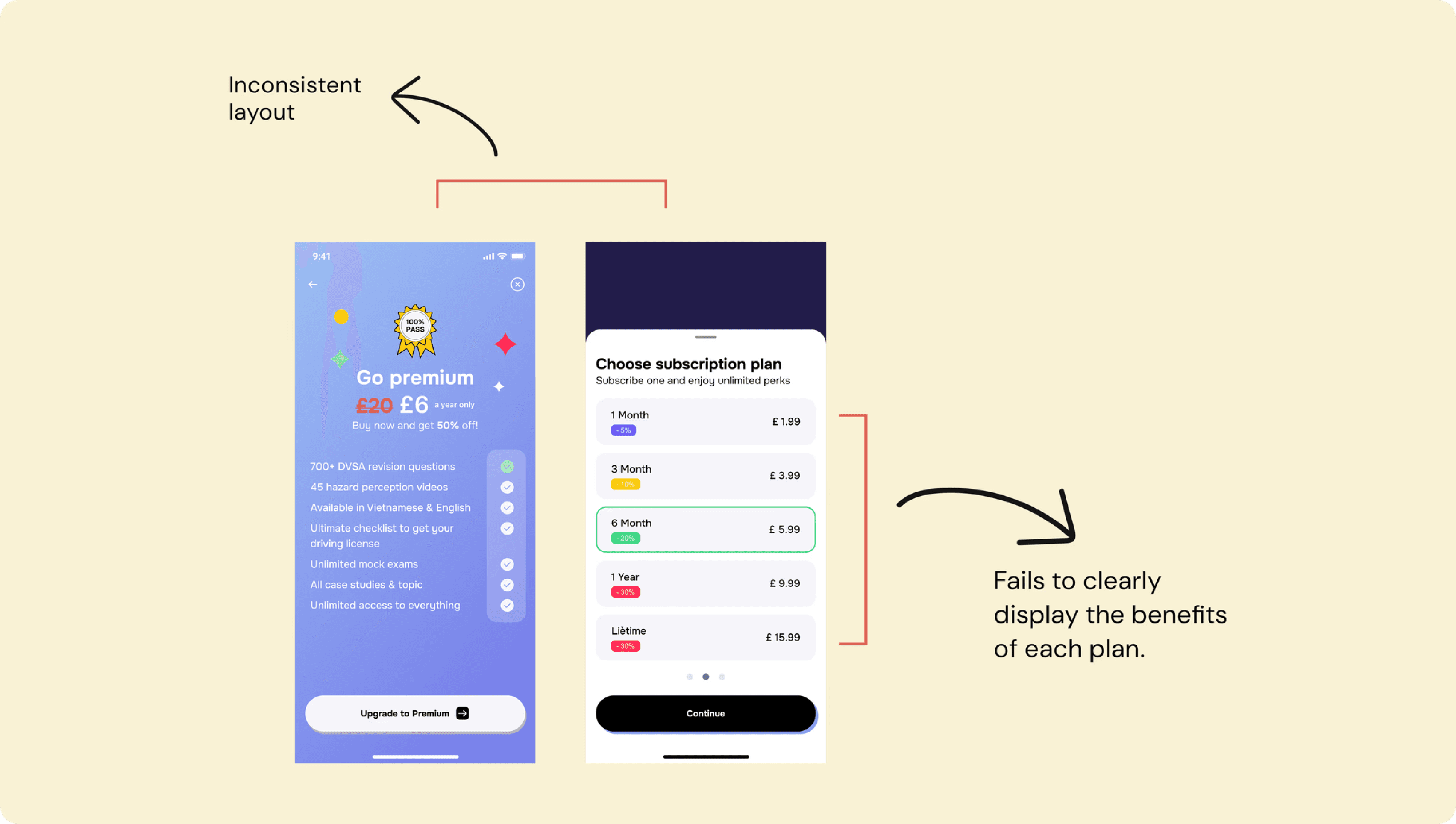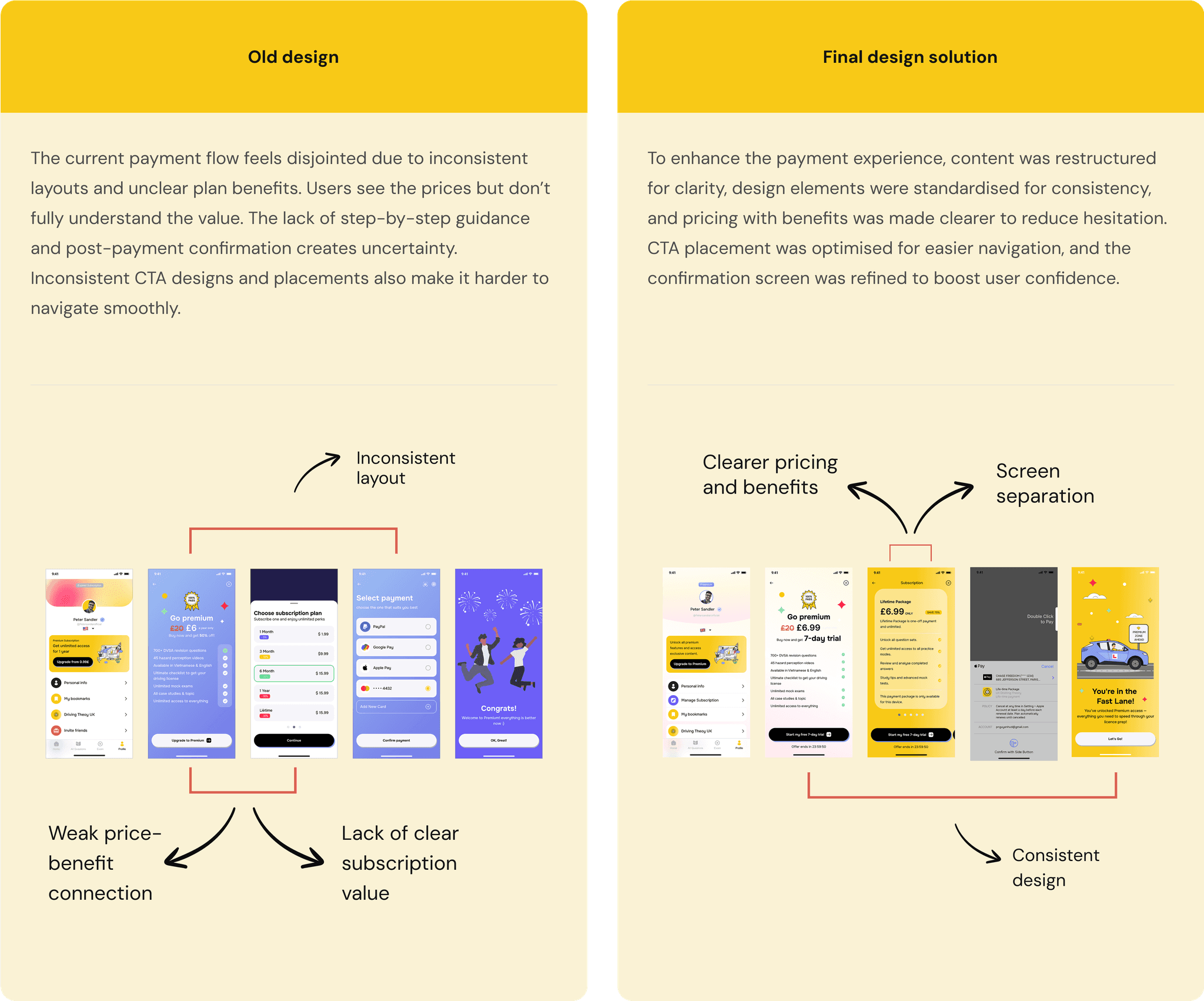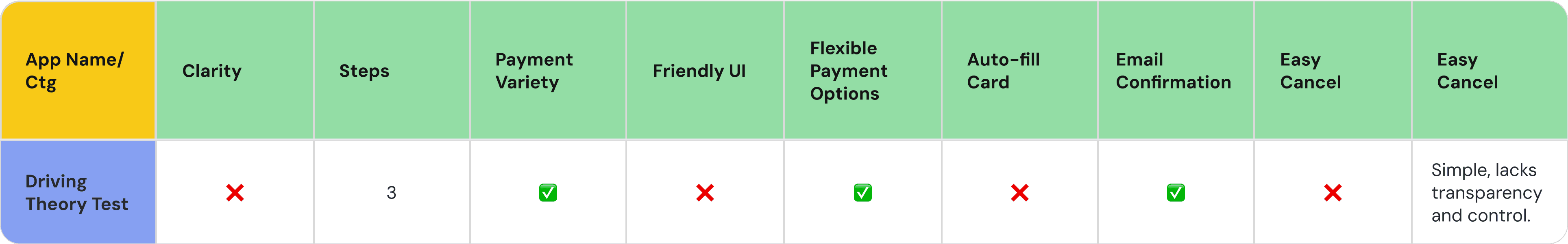 After reviewing the current flow, I analysed top competitors across driving theory, subscription, and edtech apps to identify best practices. This revealed key gaps in clarity, trust, and control, helping refine our positioning and improve the overall payment experience.