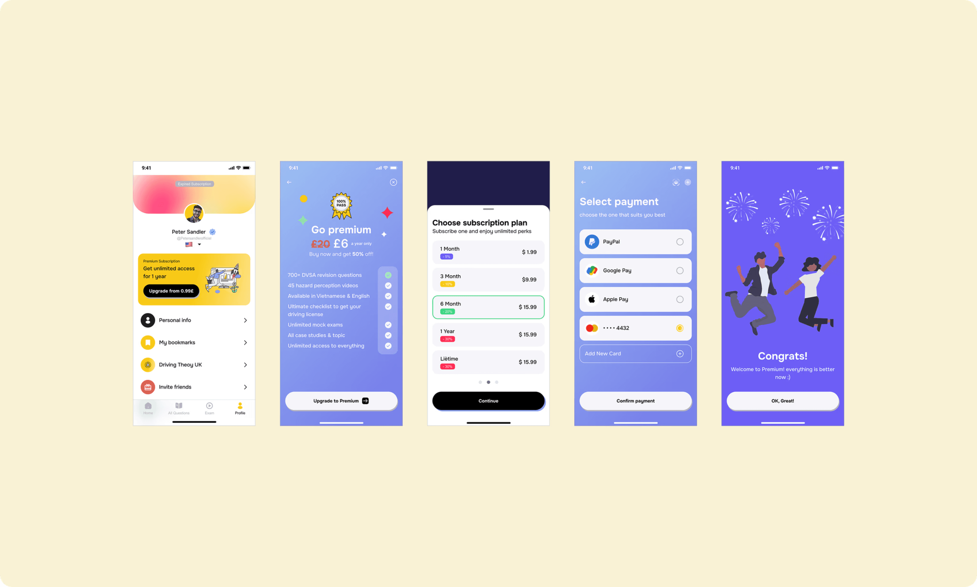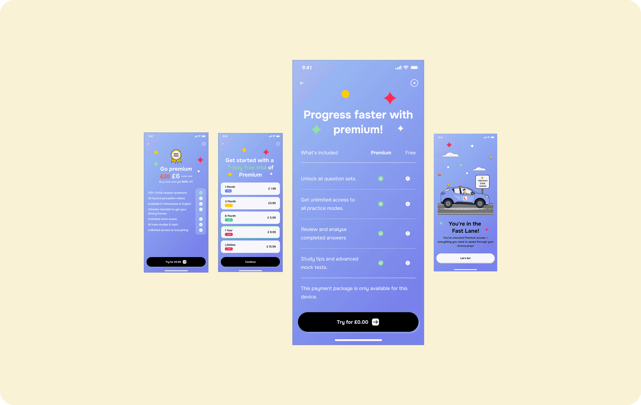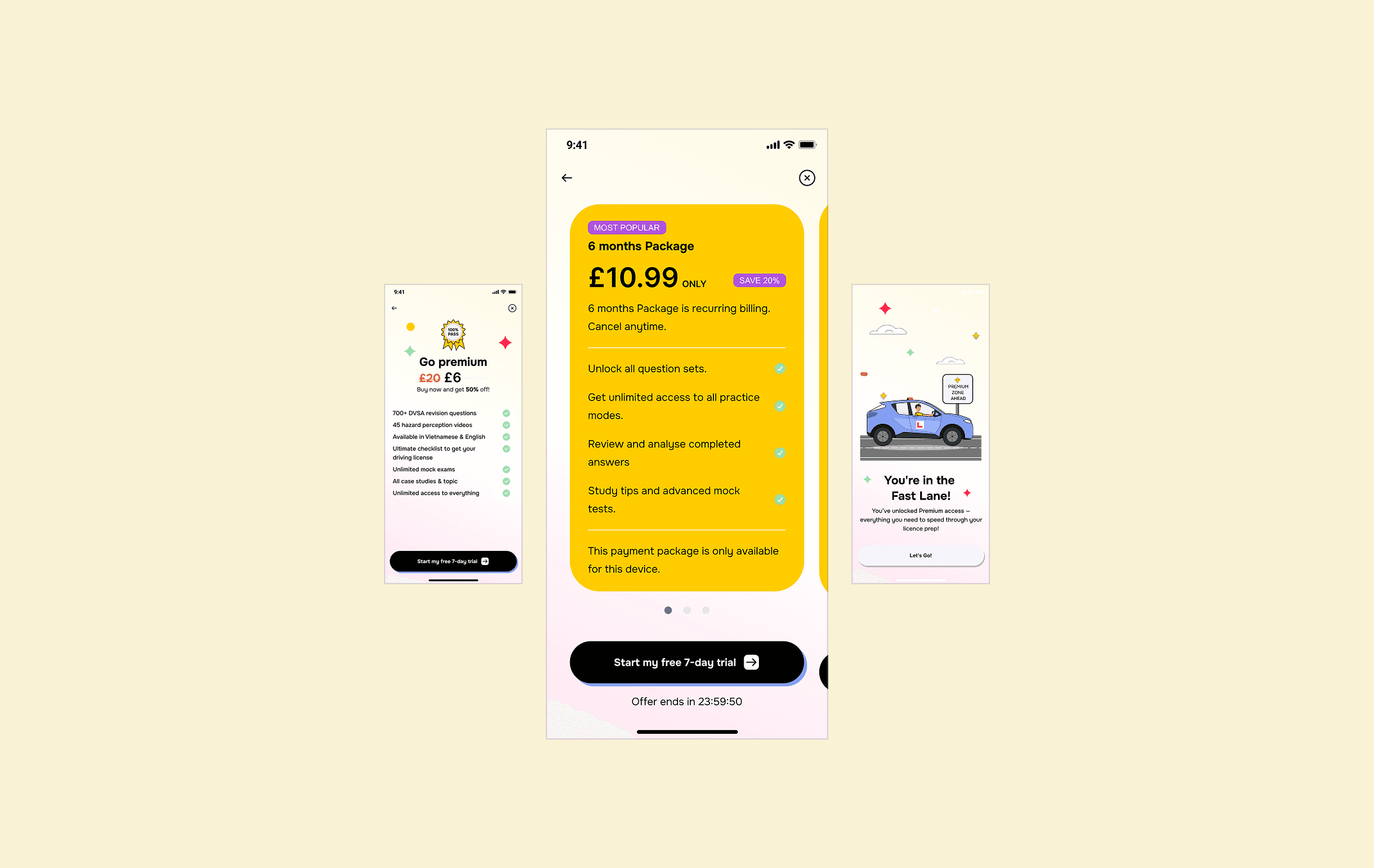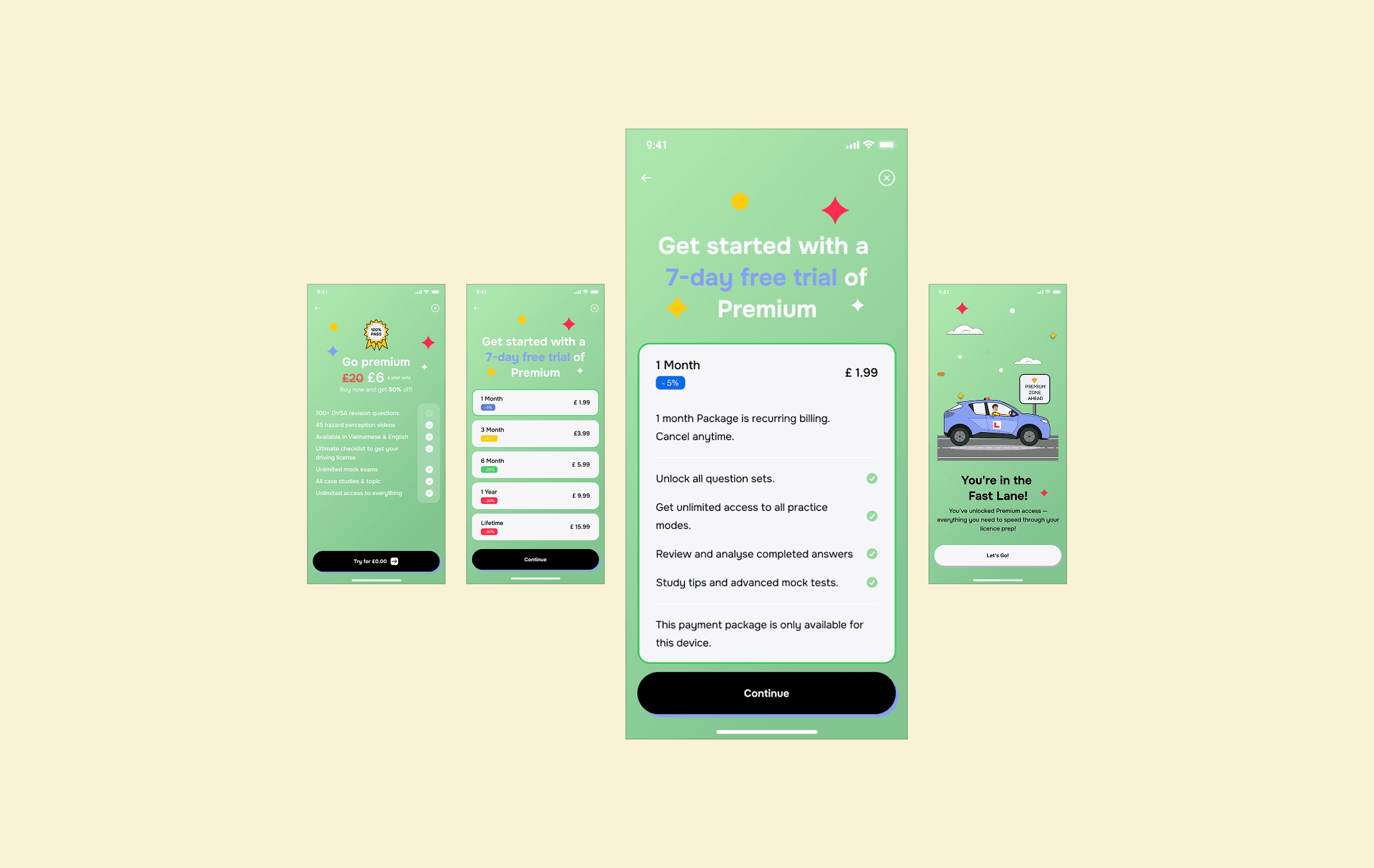 I led the complete redesign of the Driving Theory Test app’s payment flow, overseeing the project from research to launch within 3 months. My key contributions included: