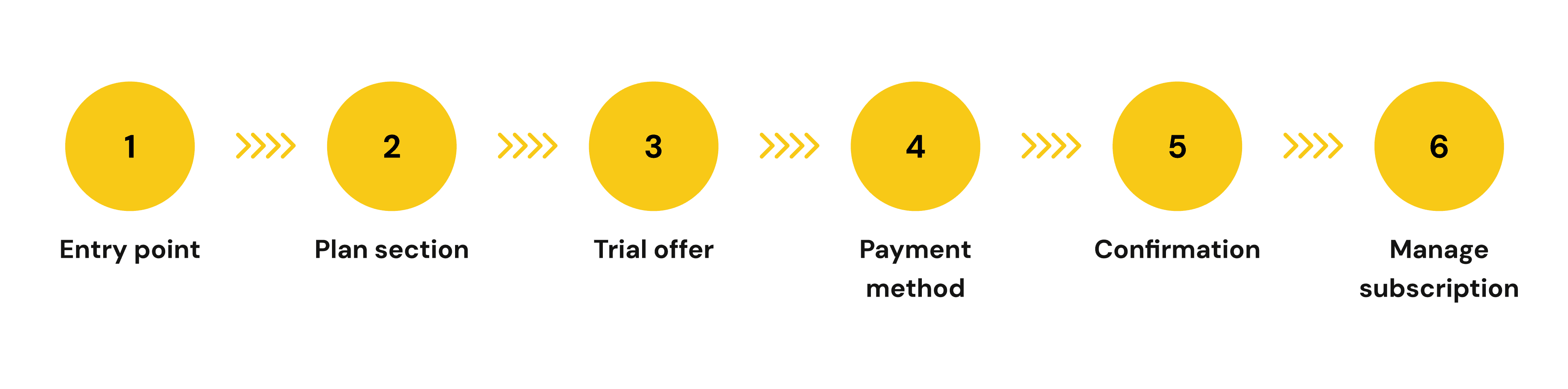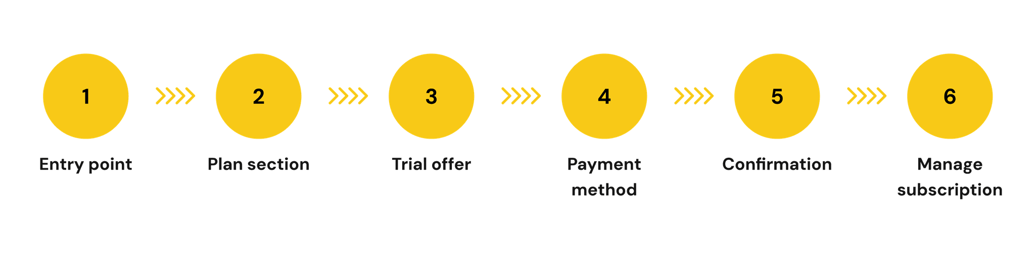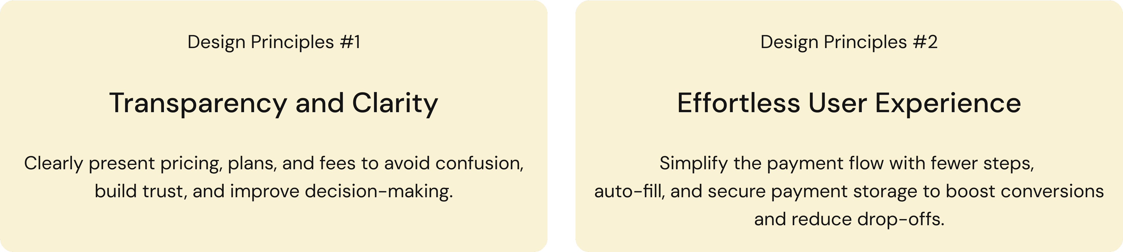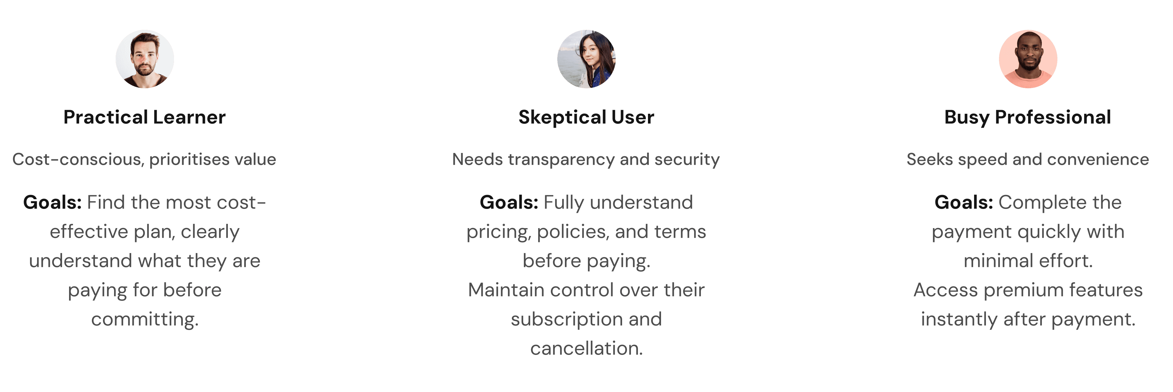 The purpose was to map out user interactions and emotions, ensuring the design addressed key friction points for all user segments. I learned that unclear pricing and lack of control at critical stages significantly impacted user trust and satisfaction, reinforcing the need for transparency and simplicity in the payment flow. This step guided the design strategy by prioritising solutions like simplified plan selection, a 7-day trial, and a Manage Subscription feature, enabling me to focus on high-impact areas and align with business goals in the Design + Iterate phase.
