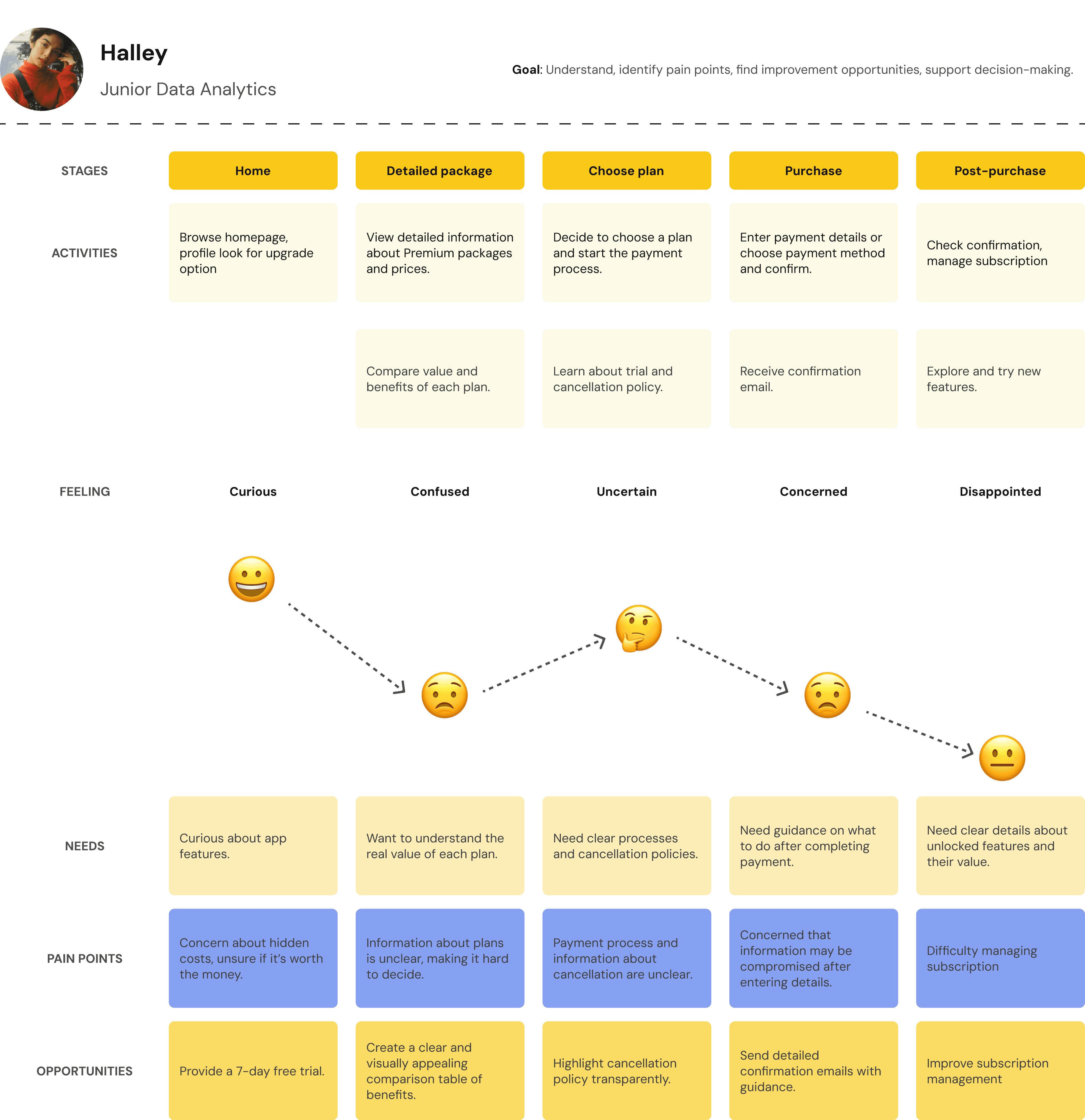 By mapping the customer journey, I identified key friction points. Users struggled to locate the “Upgrade” button, encountered unclear pricing and hidden costs, and faced a lack of transparency around cancellation policies and security. Additionally, there was no noticeable difference before and after upgrading, making it difficult for users to perceive the value of each plan.