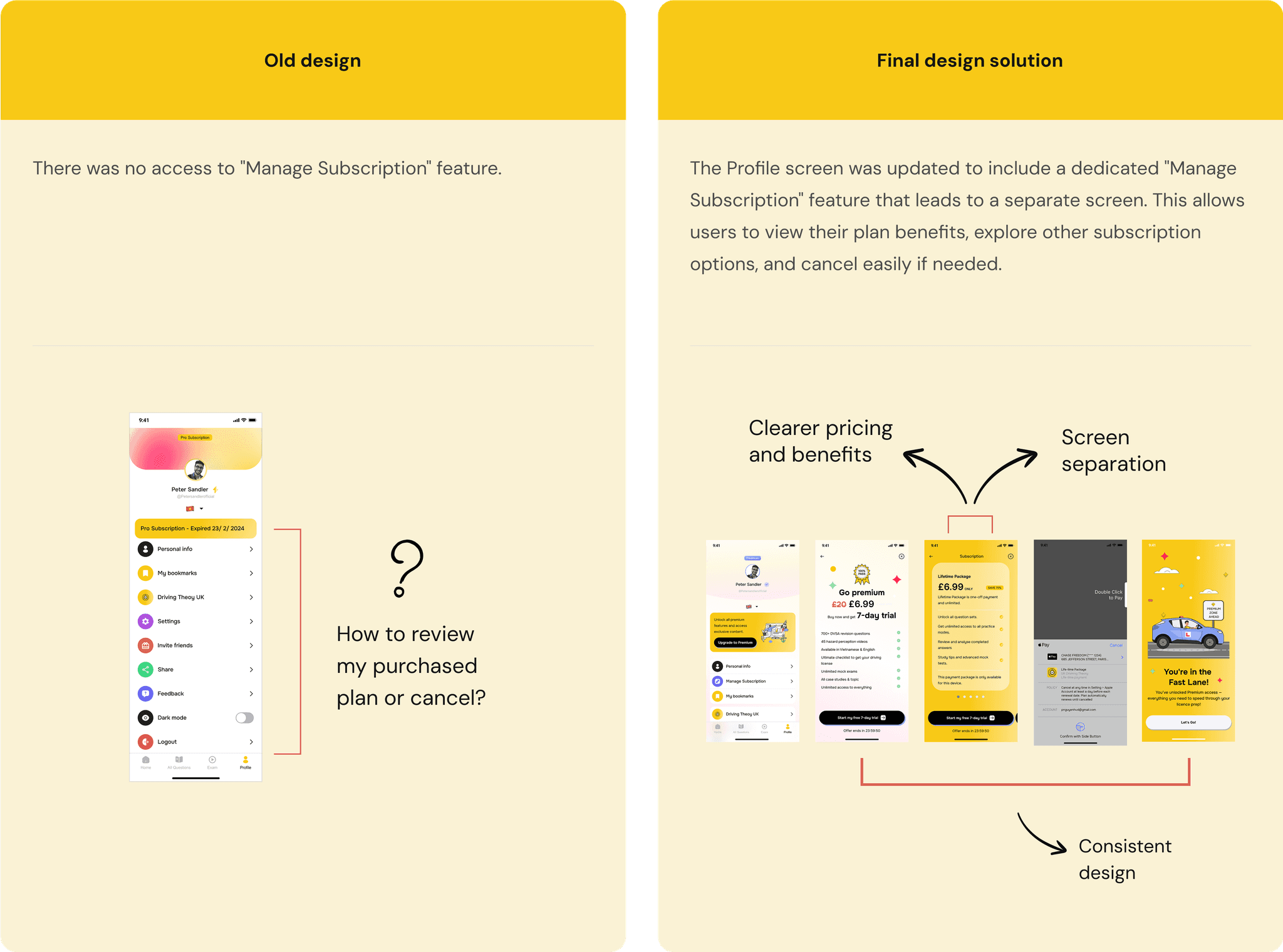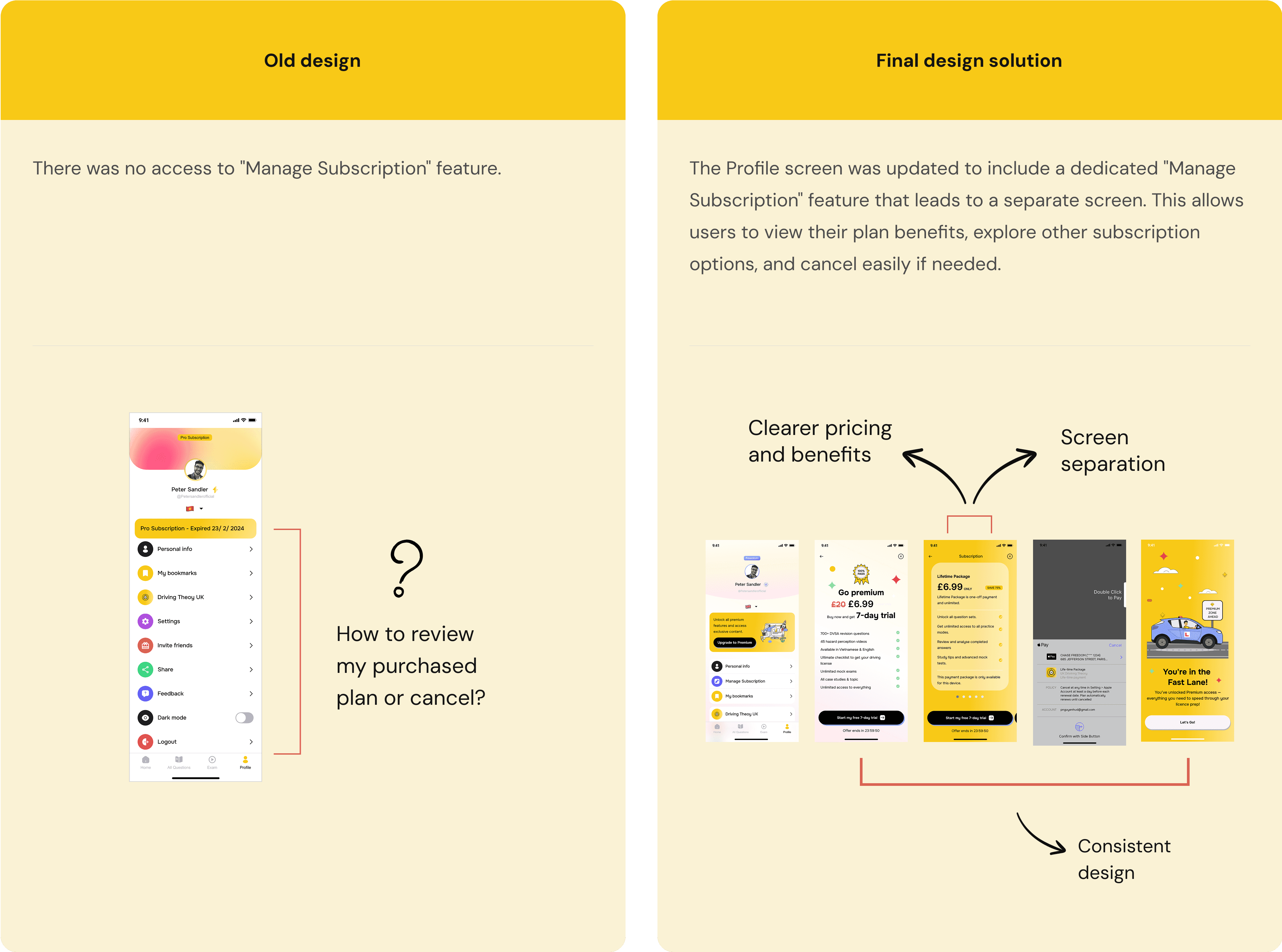 After conducting Usability Testing, major issues such as unclear package value communication, Manage Subscription, and Cancellation were resolved. Additionally, I identified minor UI issues, such as design consistency and information visibility.