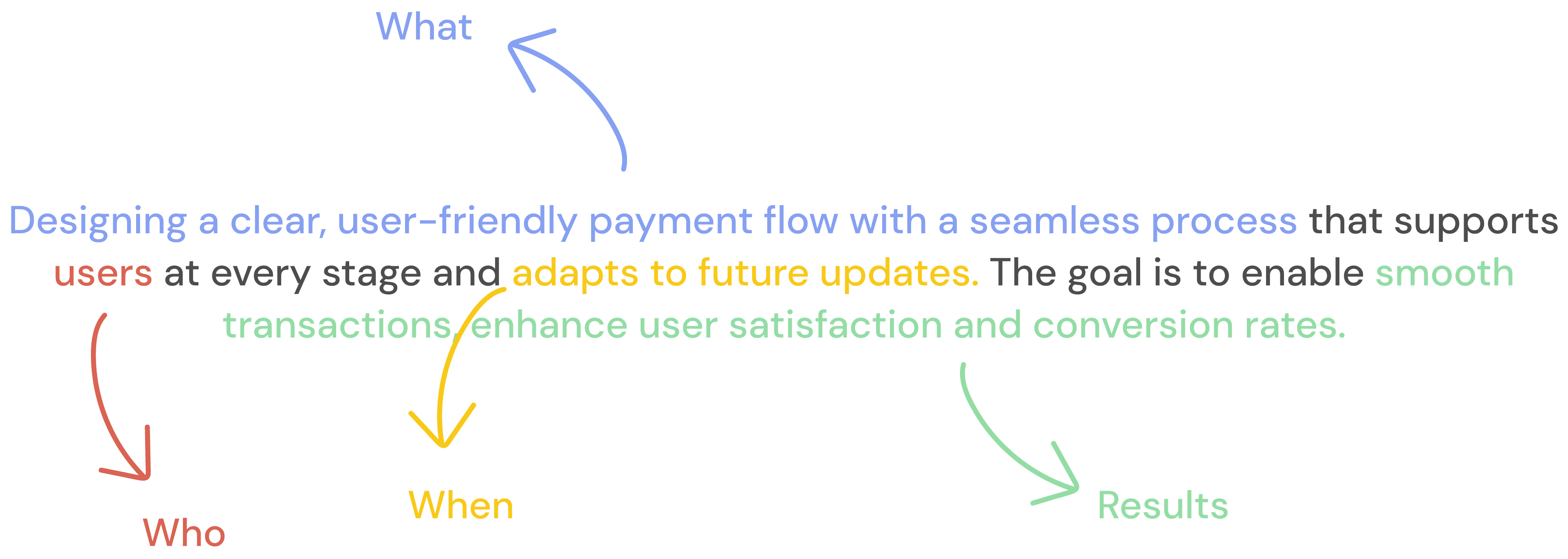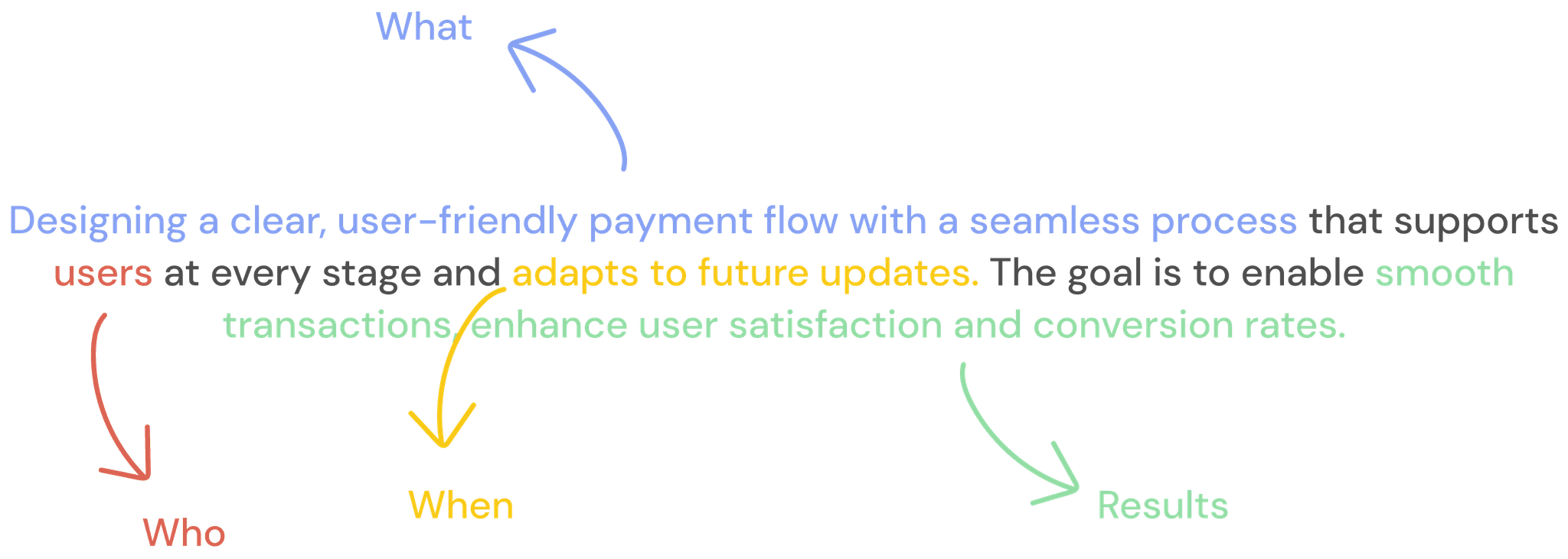 The purpose of this action was to gain a comprehensive understanding of the entire payment process, ensuring that each stage addressed user needs, supported business goals like increasing conversions, and aligned with our tech capabilities, such as Stripe integration, before moving into the design phase.