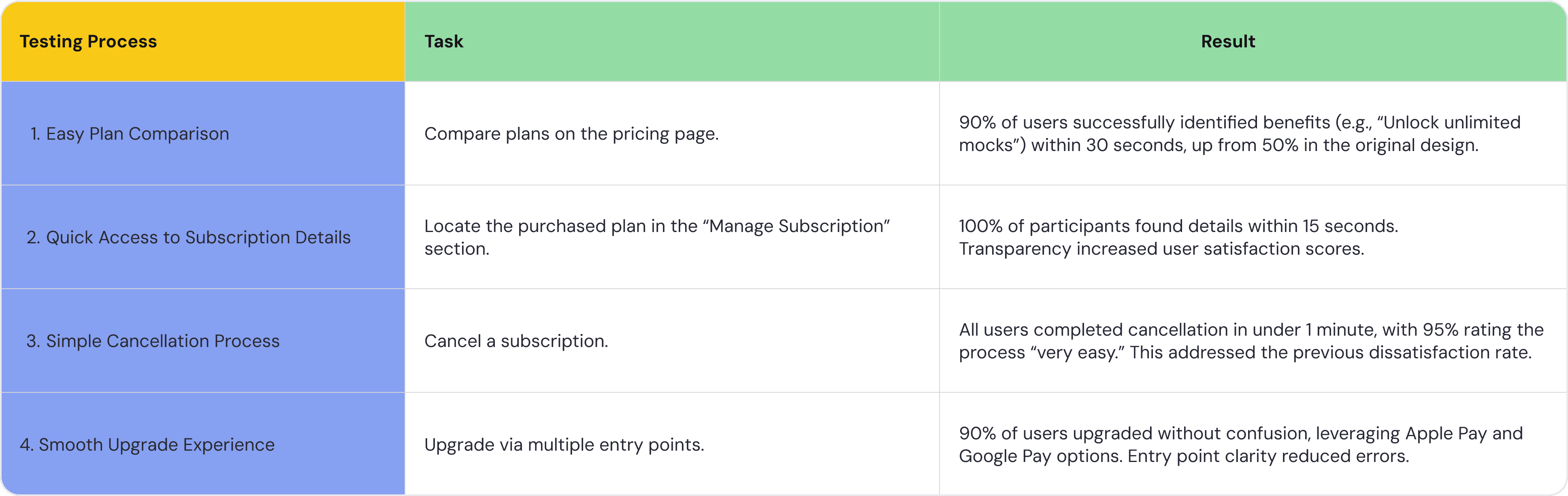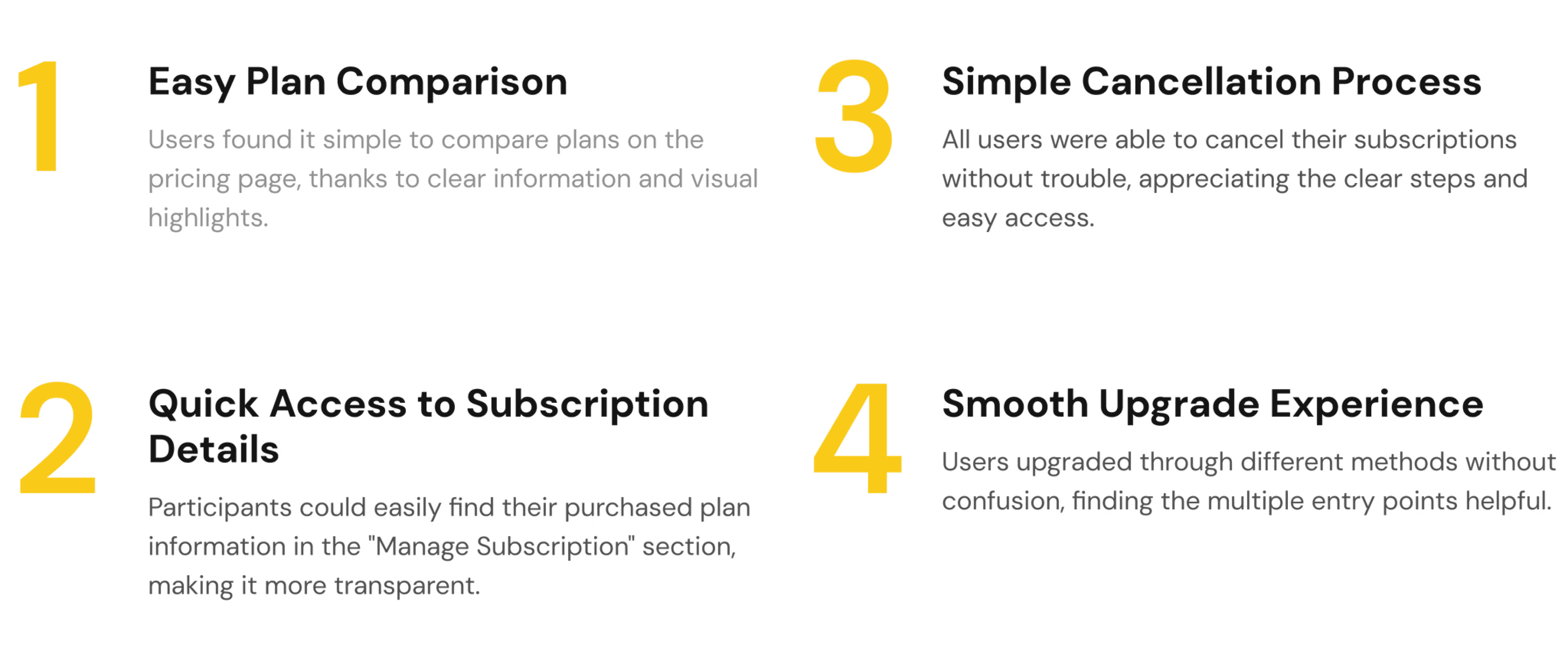 8 users (80%) mentioned frustration with subscription management, noting, “I couldn’t find an option to cancel my plan after signing up.” These insights directly informed the design decisions, highlighting the need for better subscription control.