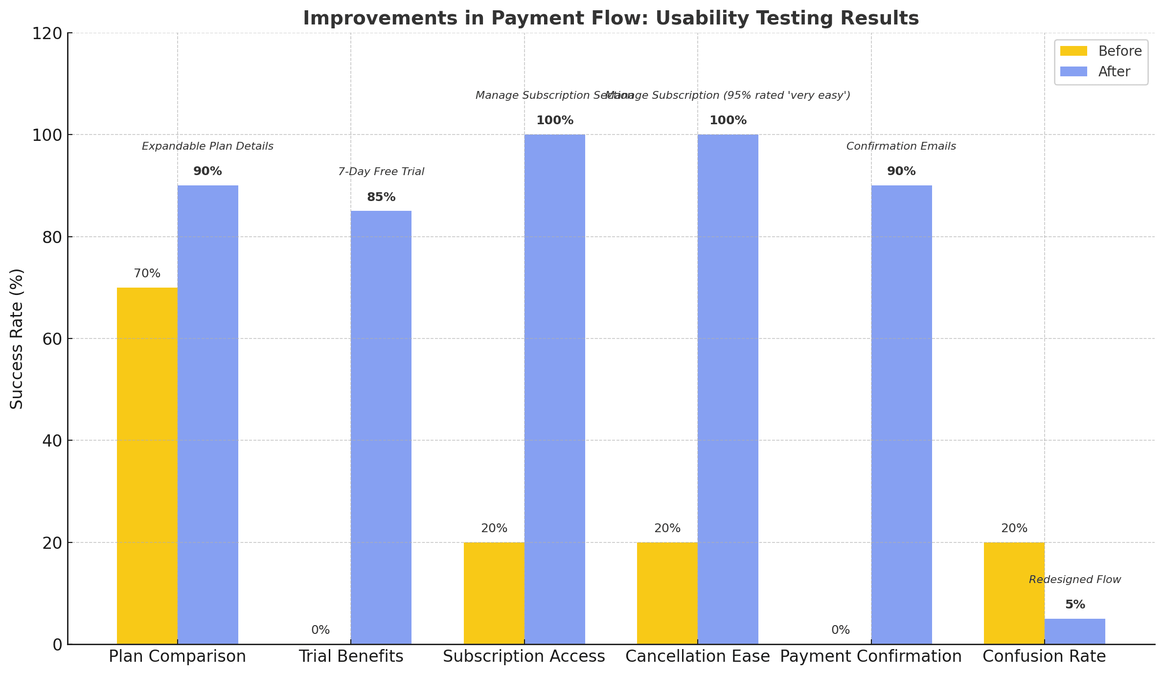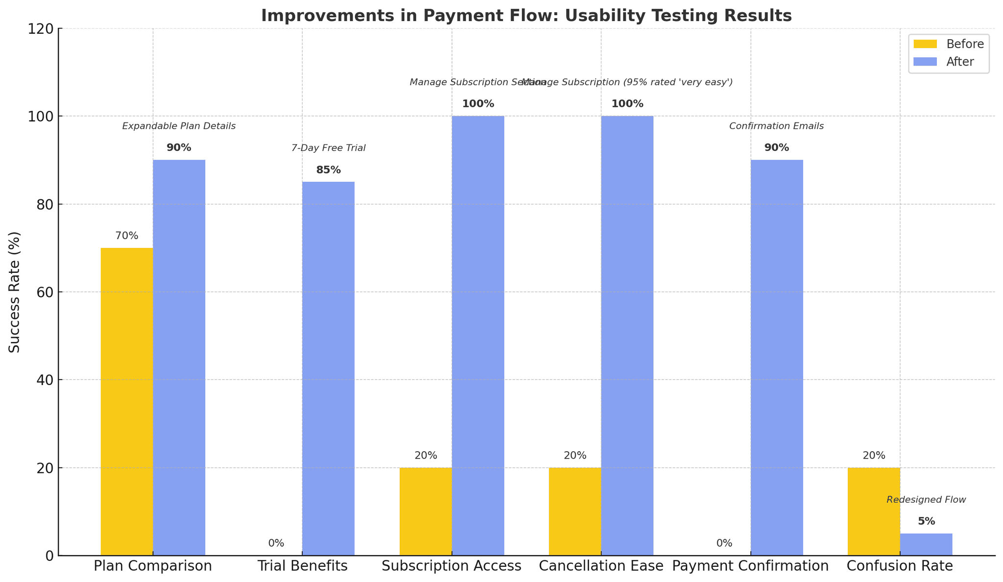 We collaborated with Product, Marketing, and Engineering to launch a 7-day free trial, Manage Subscription section, and expandable plan details, tackling unclear pricing, transparency, subscription control, and post-payment confusion. Usability testing with 10 users showed: 90% completed plan comparisons in 30 seconds (up from 50%), 80% understood trial benefits in 20 seconds, 100% accessed subscription details in 15 seconds and canceled in 1 minute (95% rated "very easy"), and 90% understood payment confirmations in 10 seconds. 80% upgraded without confusion, 12 UI issues were fixed, and Confusion Rate fell from 20% to 5%, boosting user confidence and engagement.