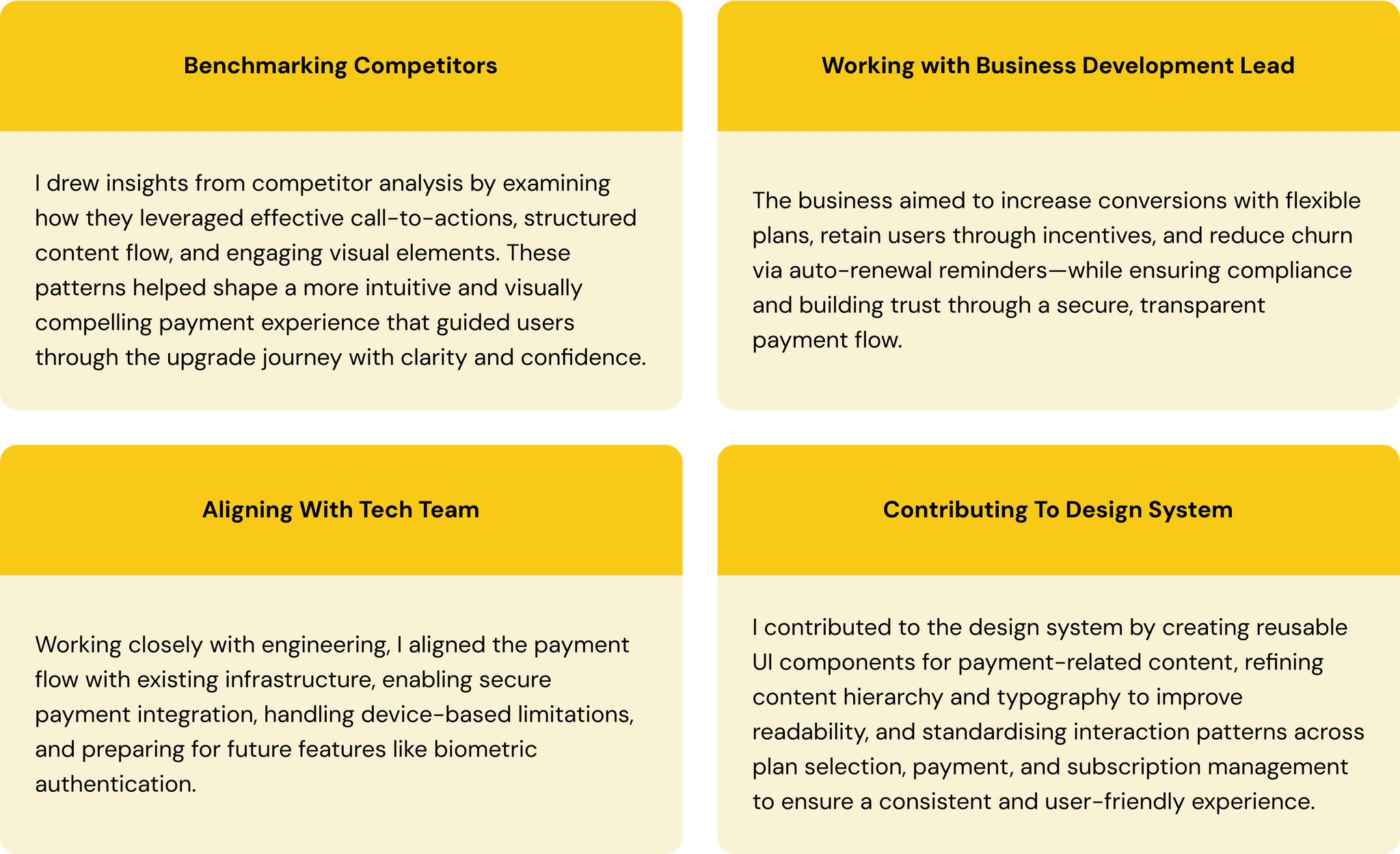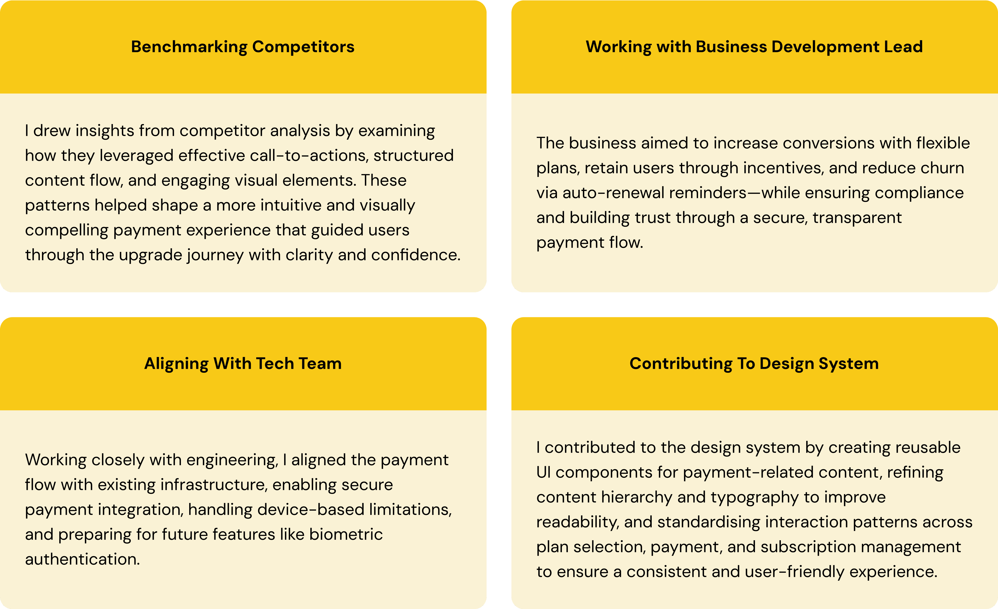 After extensive discussions and analysis, we chose Option 2 as the primary solution. This option effectively communicates the value of each subscription tier, helping users easily understand what they unlock with Premium. By separating plan details into dedicated screens, it reduces information overload and creates a structured flow for easier comparison of pricing, benefits, and policies. This option also ensures a consistent layout and visual hierarchy, improving readability, trust, and conversion rates by addressing user hesitation. Once approved, I refined and optimised the design while resolving minor issues for a seamless experience.